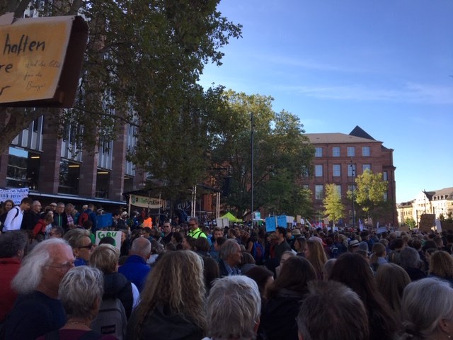 Gegen 10:00 Uhr sammelten sich die Demonstranten am Platz der Alten Synagoge, bei Traumwetter. Immer mehr strömten auf den Platz, der noch nie so viel Menschen beherbergte. Dennoch wurde appelliert, den Abstand zum Gedächtnisbrunnen zu wahren.